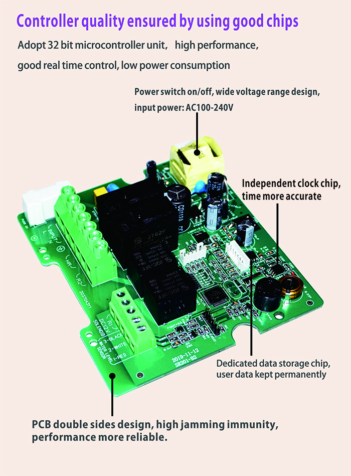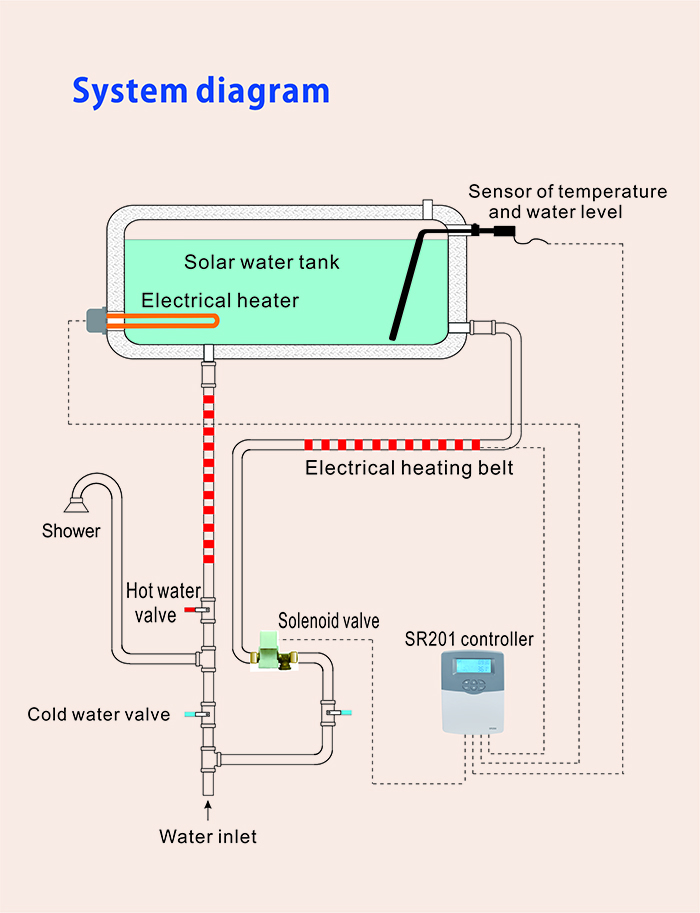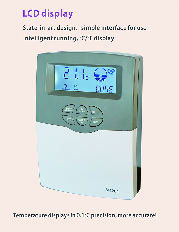 SR201 is controller with micro-computer-full-automatic used for integrated non pressure solar water heater. It is developed with high-performance 32-bit single-chip microcomputer to realize intelligent control. All devices adopt industrial standard, and can operate freely in cold, high temperature and humid environment.